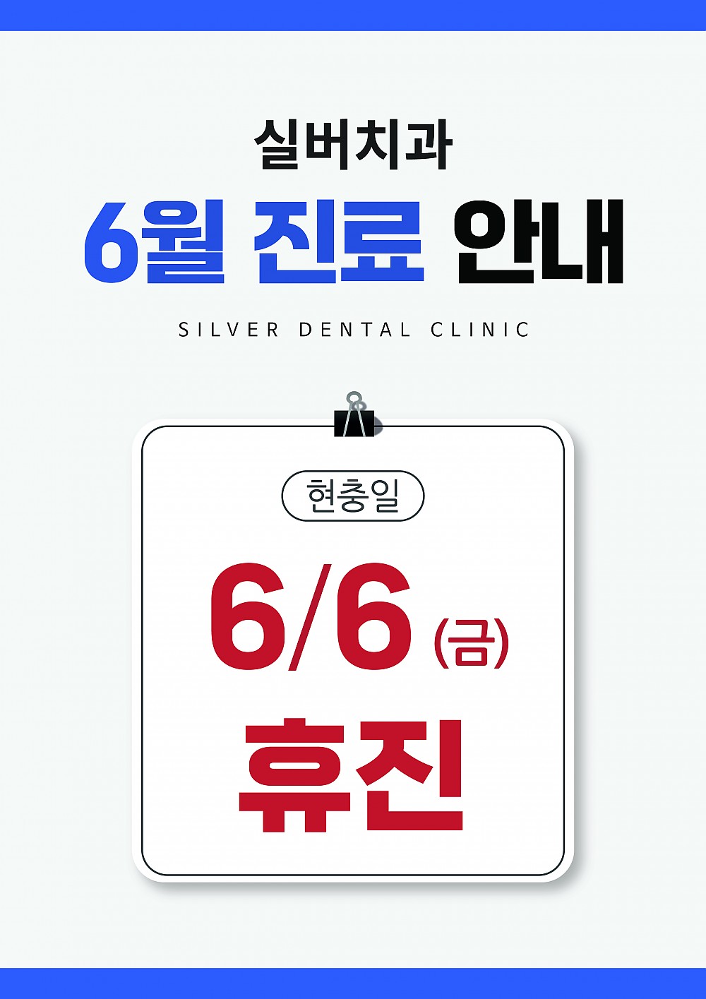 2025년 6월 6일(금) 현충일 휴진입니다. 페이지 정보 작성자 최고관리자 작성일25-06-02 12:18 조회1,607회 댓글0건 다음글 목록 본문 . 댓글목록 등록된 댓글이 없습니다. 다음글 목록